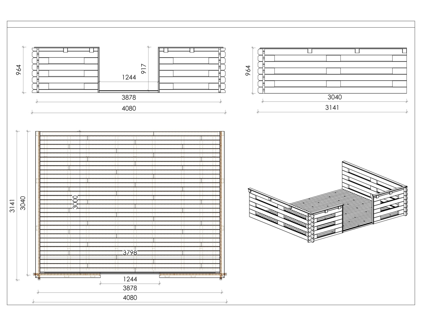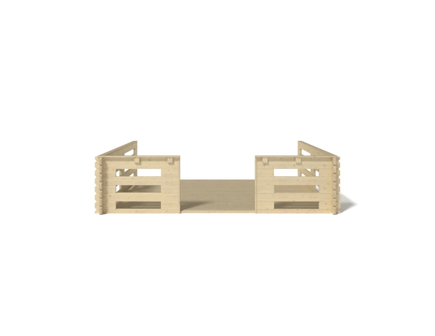 Terrasse en bois avec balustrade DOM548 d'une superficie de 12 m2, d'une largeur de 4 m et d'une profondeur de 3 m. La terrase s'adapte aux abris en bois d'une largeur de 4 m en façade et d'une épaisseur de 40 mm, proposés par ALTANKA p.s.a. Le montage avec les instructions incluses ne pose pas de problèmes.